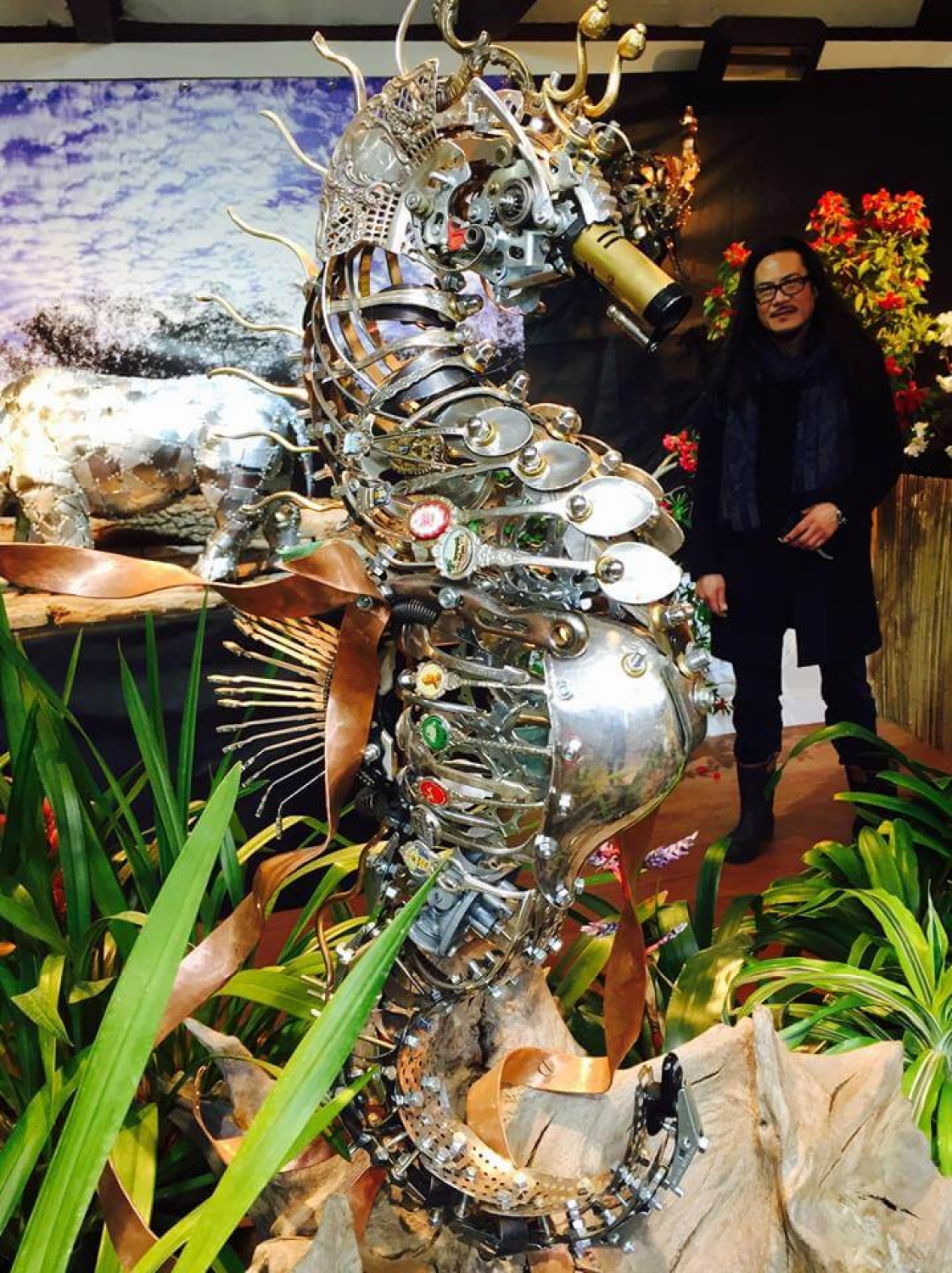 He then settled in The UK and completed his schooling. Long went on to a variety of jobs but always had art as his passion. Today he has become  a unique artist with one of a kind designs. His pieces are made from recycled metal, ranging from pots and pans to plumbing pipes and carpet dividers – his imagination shows no bounds. Daily items that you would not consider art at all have been turned in to stunning creations with Long’s ingenuity and skill.